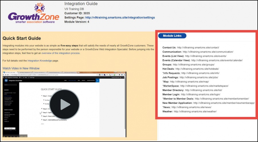 - The Module Links will appear on the right side of the Integration Guide page at “/integration/” and you can click to view, or copy the link to the desired module page for adding to the new website.