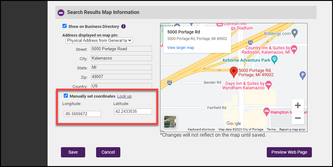 - In the Search Results Map Information section, select the Manually Set Coordinates box.