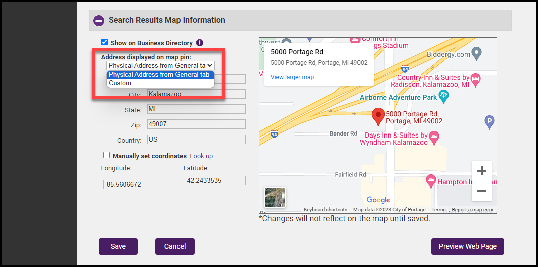 - Choose Physical Address from General Tab to use the address entered on the general tab, or select Custom from the dropdown list to enter an address. The map will populate the location based on the address you have entered. If needed, drag the marker to refine your position on the map. Select Save.