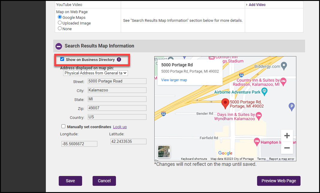 - In the Search Results Map Information section, select the Show on Business Directory radio button.