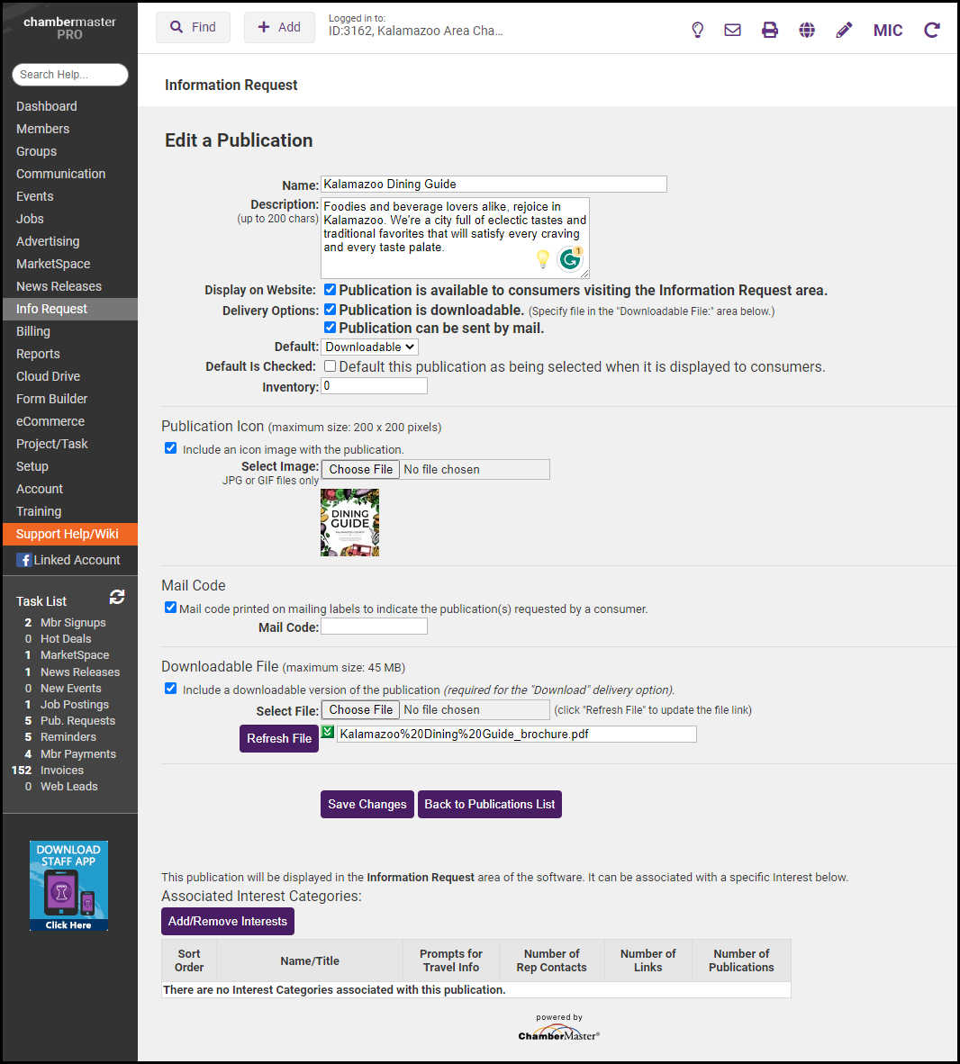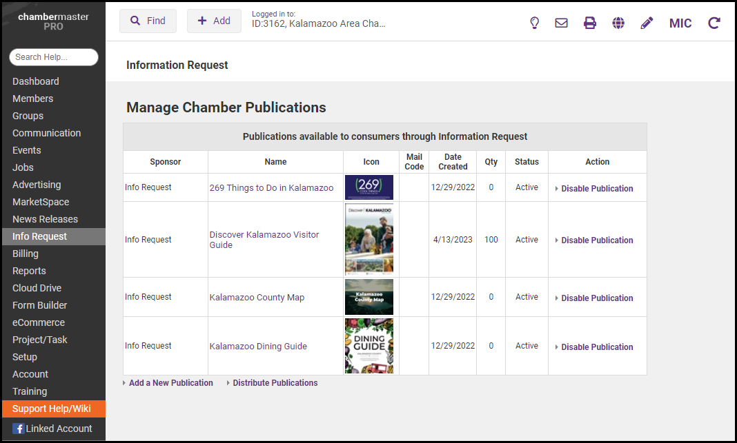 Each printed publication and each file that is available for distribution must be set up in the Info Request module by selecting Chamber Publications. Each publication will be named and described for internal purposes and also for display on the public website (if applicable). After specifying whether the information is in printed or file format and whether this information is available on the public website, the following are additional options: