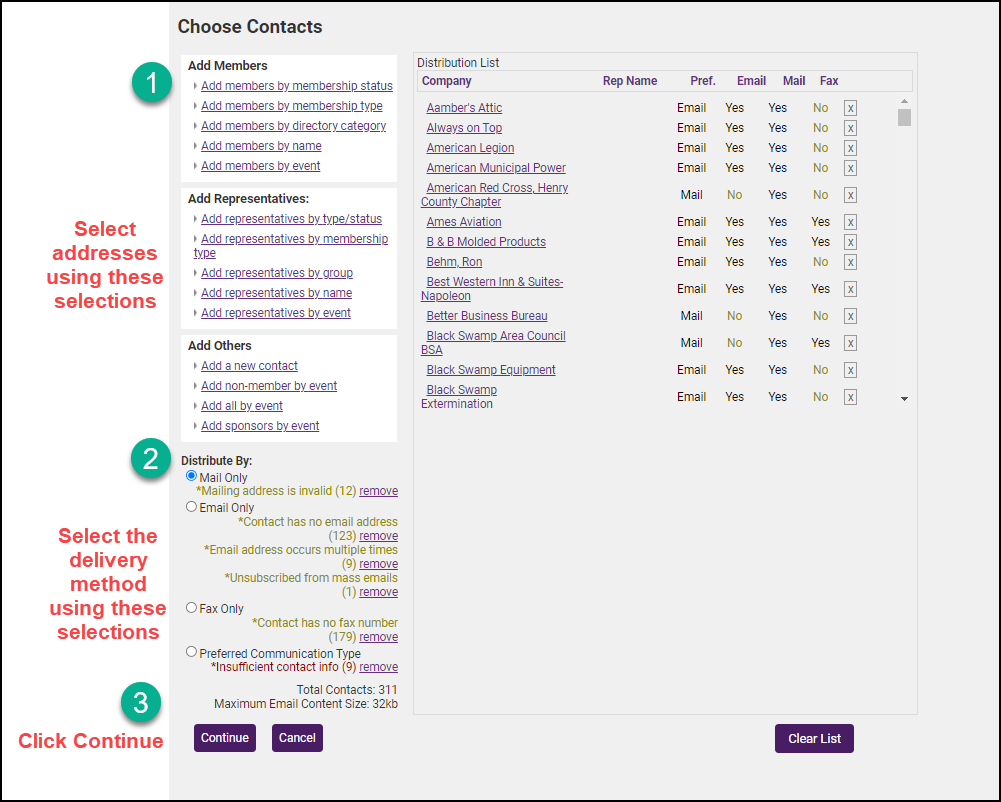 - NOTE: Addresses selected under the Add Members heading will use the contact information found on the General tab of the member’s record. Addressees selected under the "Add Representatives" heading will use the contact information found on the Reps tab of the selected individual representative.