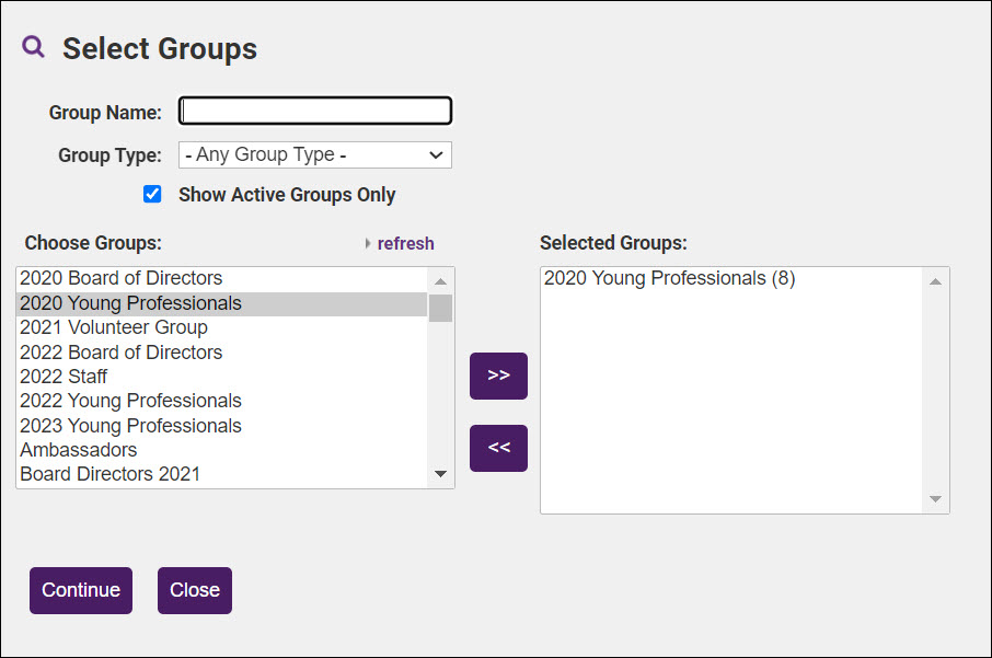 Click >> to move the desired group(s) to the Selected Groups list box. You can choose as many groups as needed.