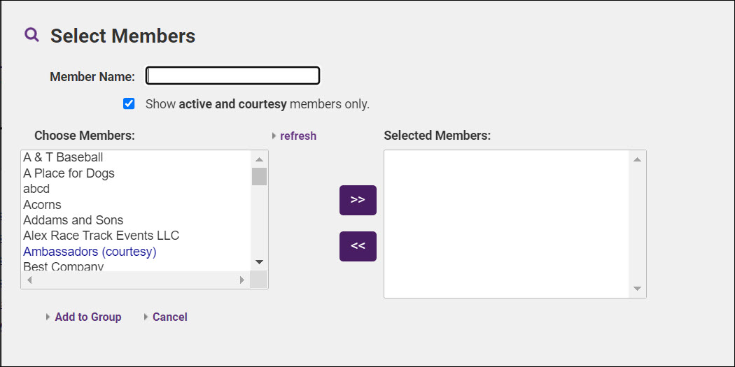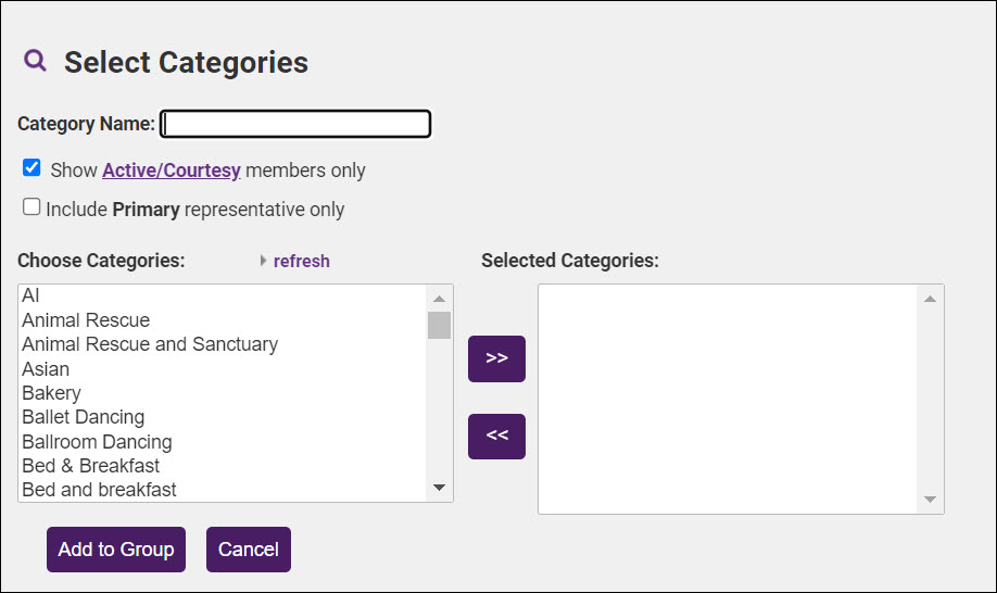 You can choose to view only those members who are active or clear the Show Active/Courtesy Members only. Additionally, you may choose to add only the primary rep to the group. Choose the desired category and click >>.