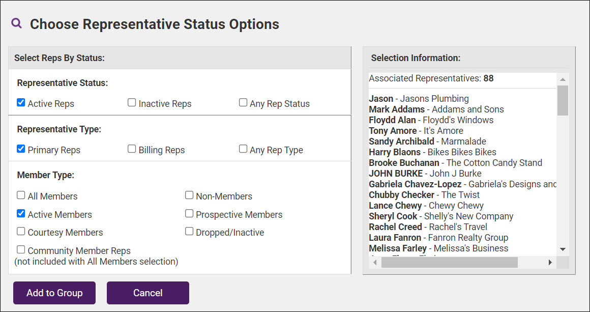 This option allows you to choose your members by the status of representatives, representative type, or member type