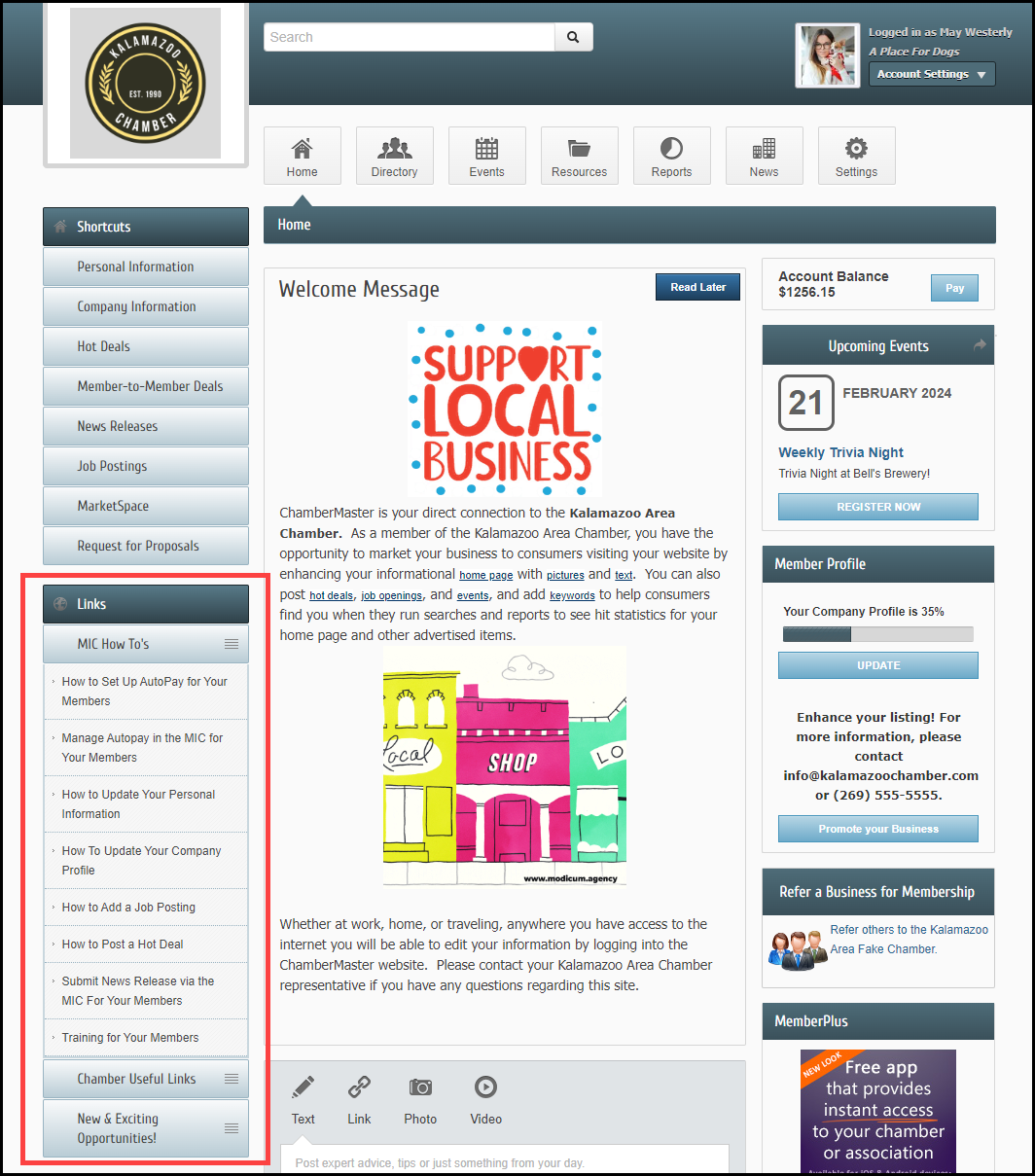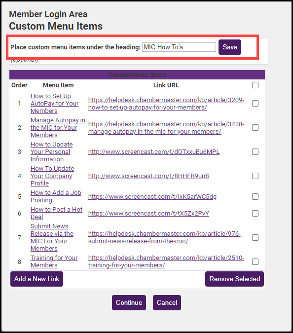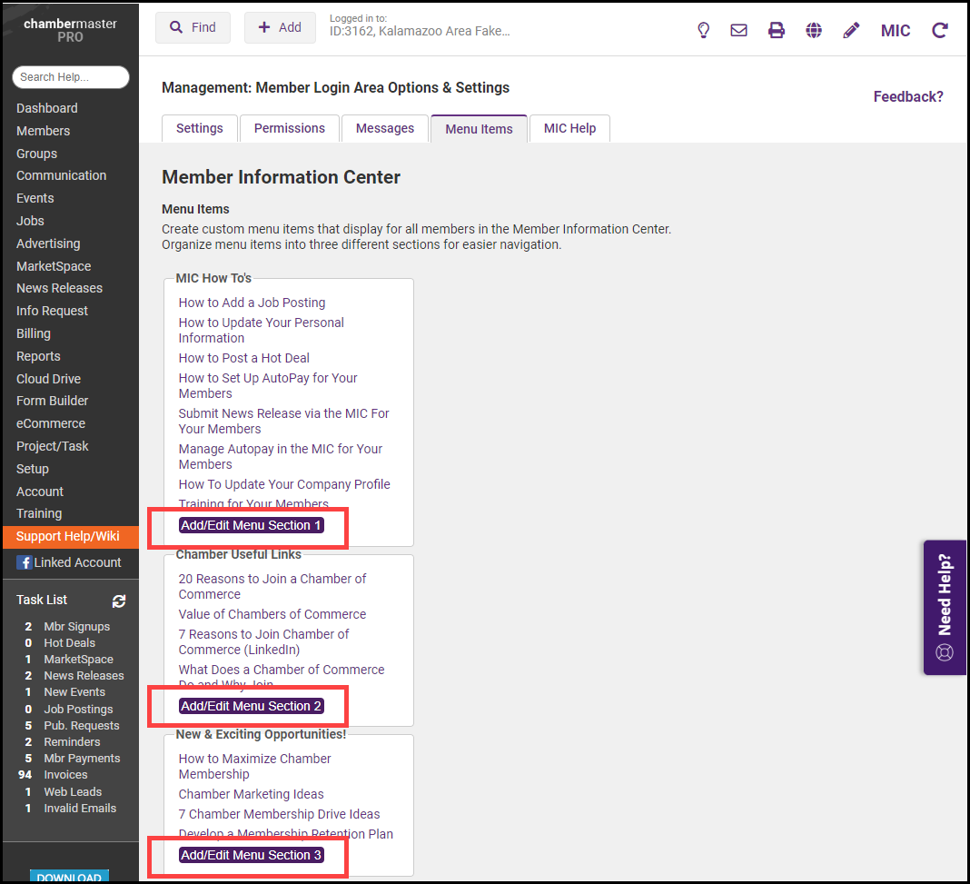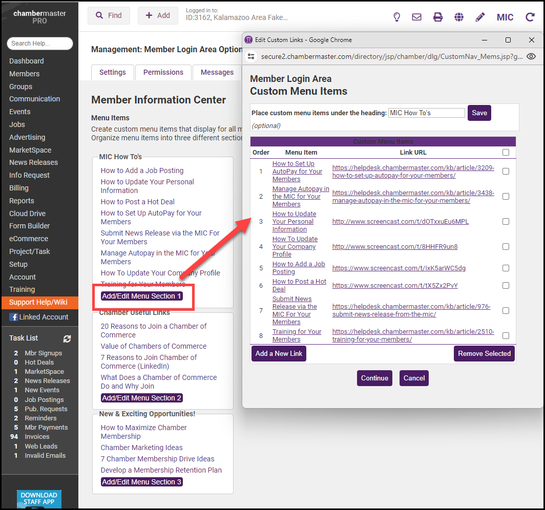 - Select which menu section you would like to edit. Each section represents a separate section of the menu displayed in the Member Information Center.