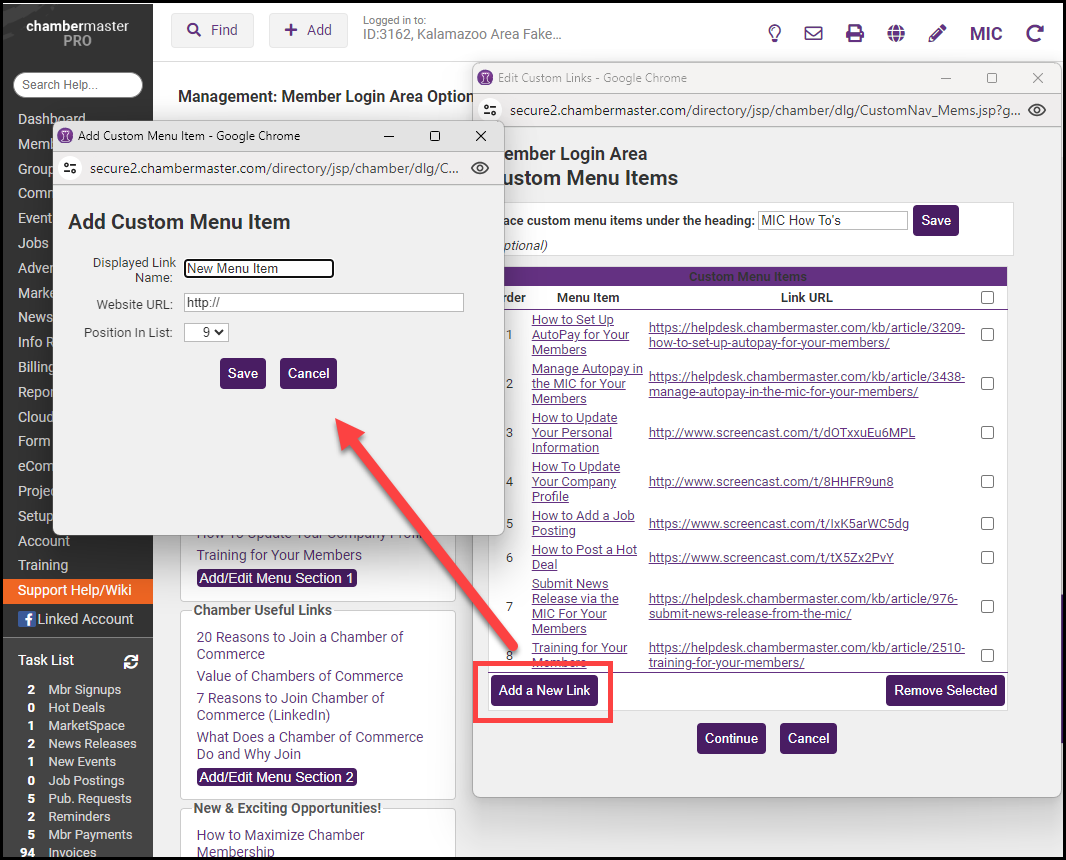 - Select Add a New Link to add to the menu section. Include the Display Name for the link, the URL, and where the link should be positioned in the list.