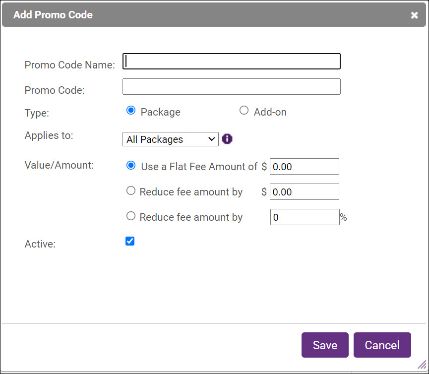 - Choose the desired Type. Promo Codes can be used for membership packages or for add-on items. If Package is selected, choose the package to which this promo code can be applied OR select All Packages. NOTE: Promo Code discounts can only be applied to packages set up with Fee Type of Fee Items. If the package is set up with Fee or Schedule pricing a promo code may not be created.