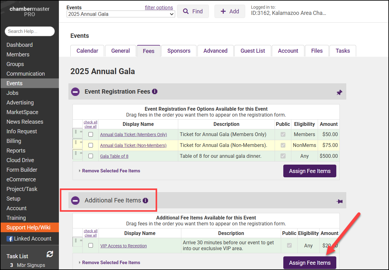- Select the Fees tab for the event.