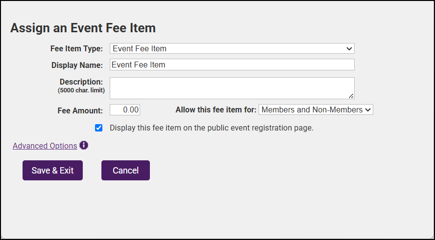 Display this fee item on the public event registration page: Selected by default. If deselected, the item will be available to back-office staff when registering a guest.