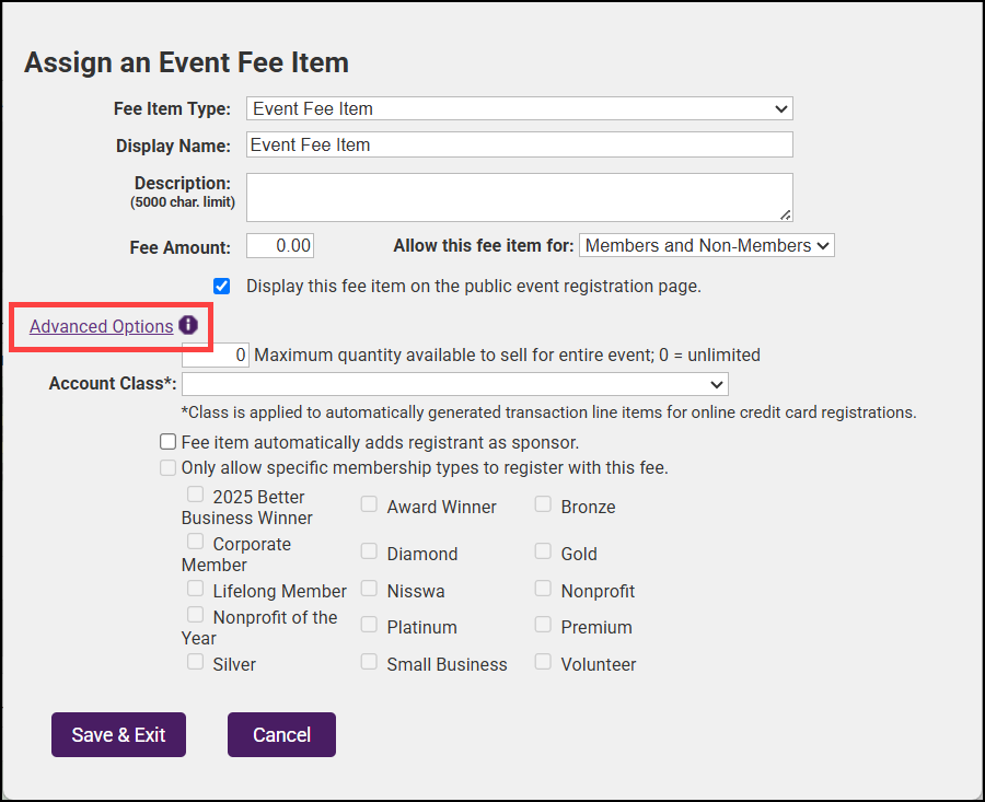 Allow this fee item for: Defaults to Members and Non-Members but can limited to either using the dropdown menu.