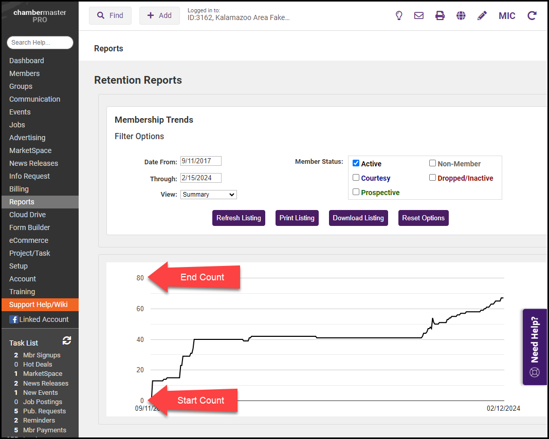 Start Count and End Count can be found by using the Active Members report (Dashboard > Membership Tab > Active Members > View Detailed Report). Generate the report for the desired date range. NOTE: This report is only updated on Mondays, so it will not do an exact month/year.