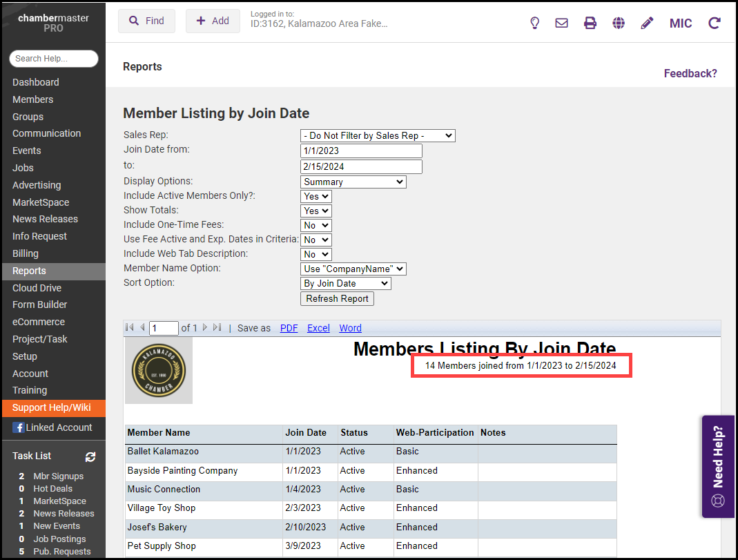 - Click View Report. The number of new members will be displayed on the report.