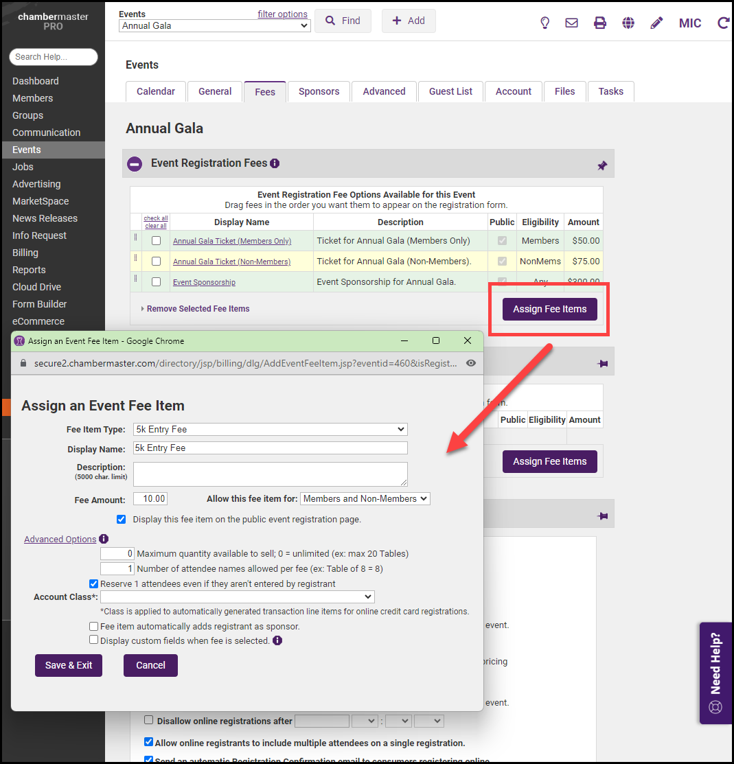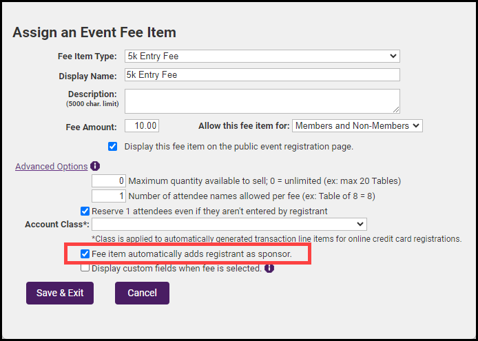 In order for sponsors to be added to your Sponsorship tab, you must create fee items that add the registration as a sponsor. To do this, you will check the Fee item automatically adds registrant as sponsor option when creating your registration fees.