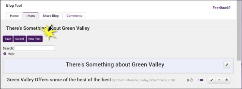- On the Blog Tool Home tab, click the blog that you wish to post to. The Posts tab will display. NOTE: You are adding a post to an existing blog NOT creating a new blog.