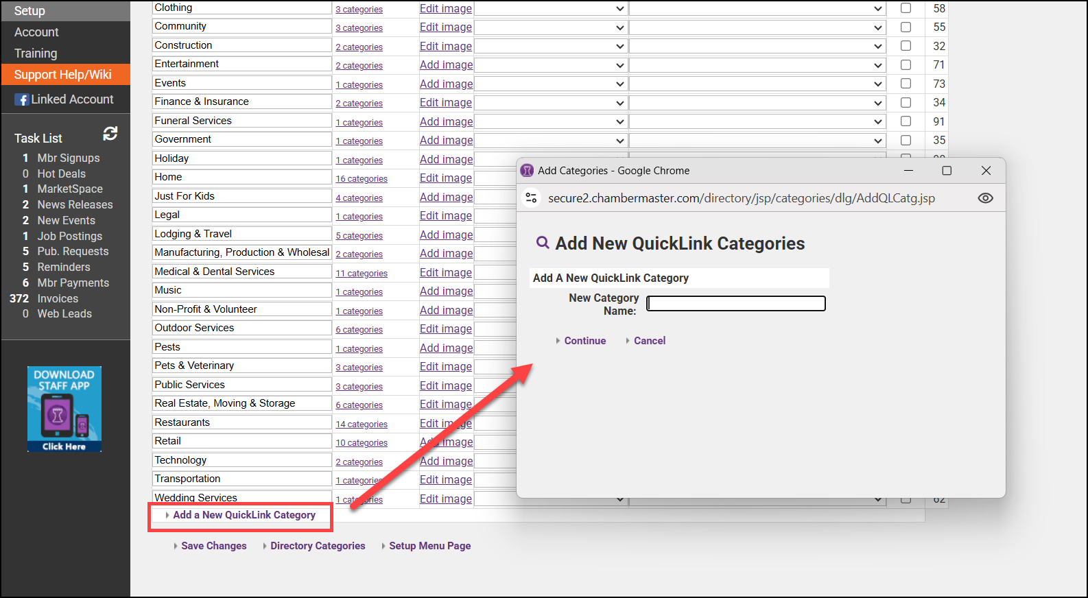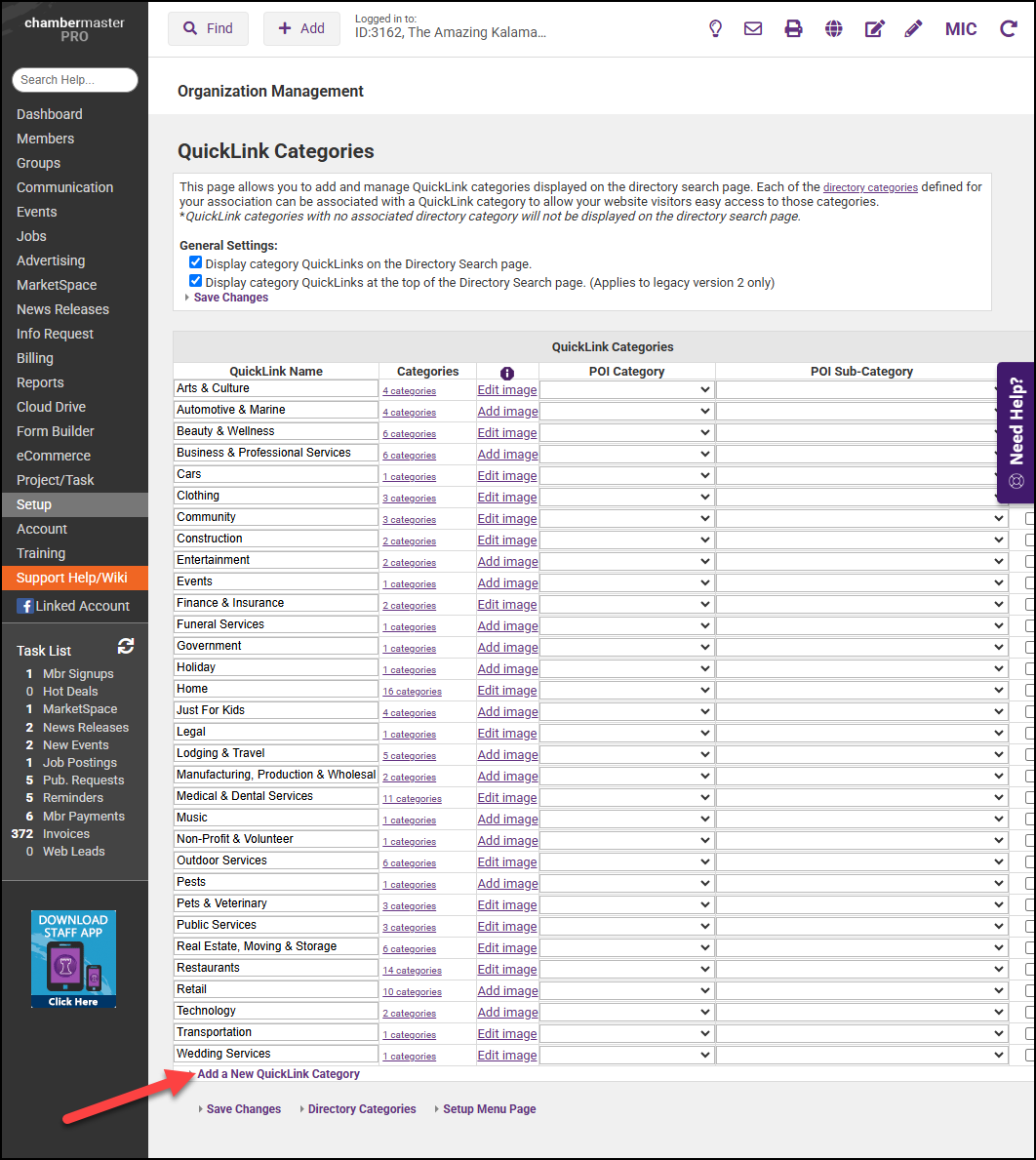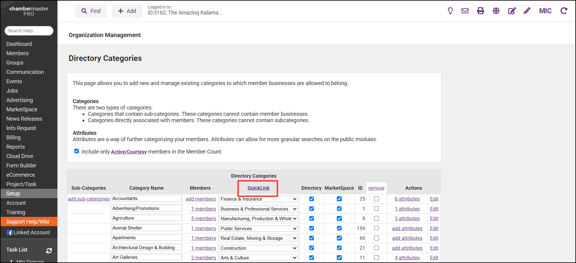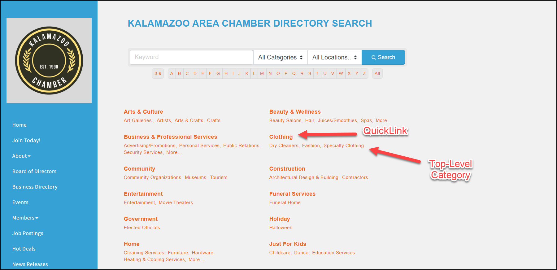Business Categories are used to group related members by their business type. Directory QuickLinks are the main categories (displayed in bold) within your directory. Your software has been populated with the industry standard links, and you may add additional QuickLinks as needed.