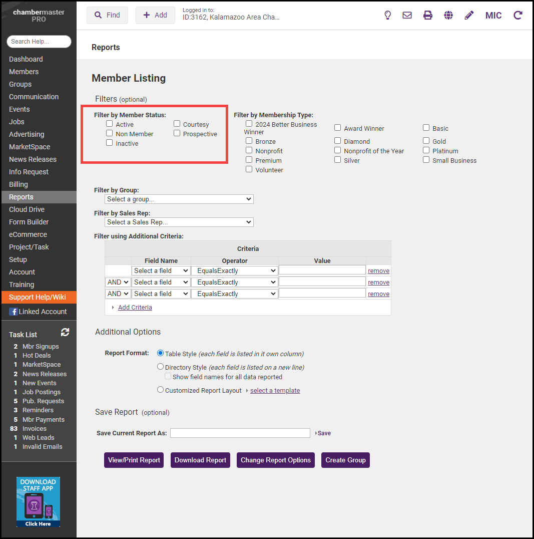 On the Filters page, select the types of members to include in the report (Active, Non Member, Inactive, Courtesy, and/or Prospective).