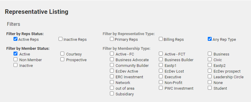 - Filter by Representative Type: Select the desired representative type(s). For Example: If you wish to only include billing reps in your report, click the Billing Reps check box.