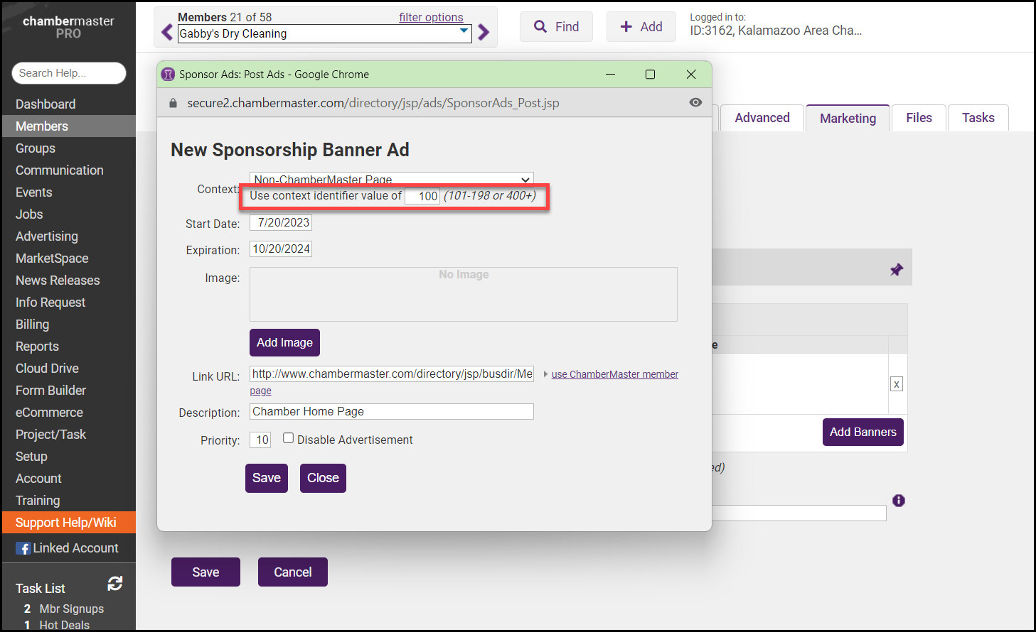 - Follow the steps found in Add a Banner Ad and when selecting the Context in Step 3, select Non-ChamberMaster Page.