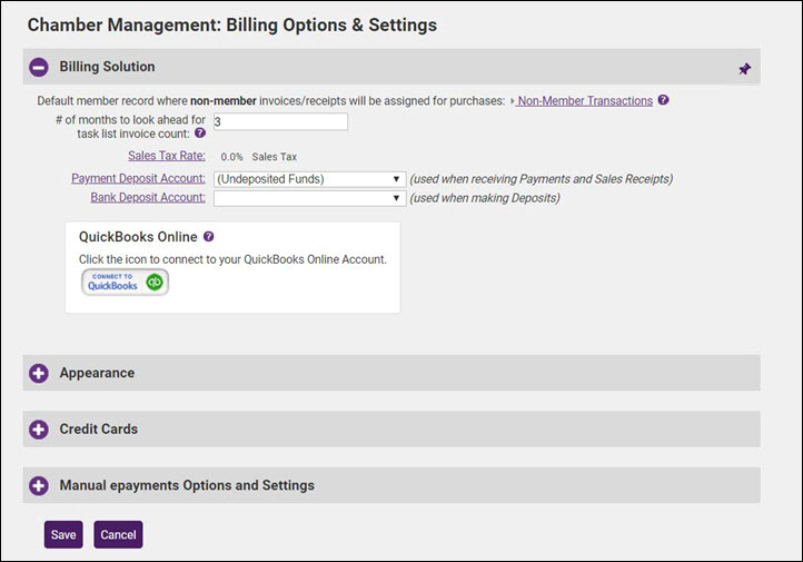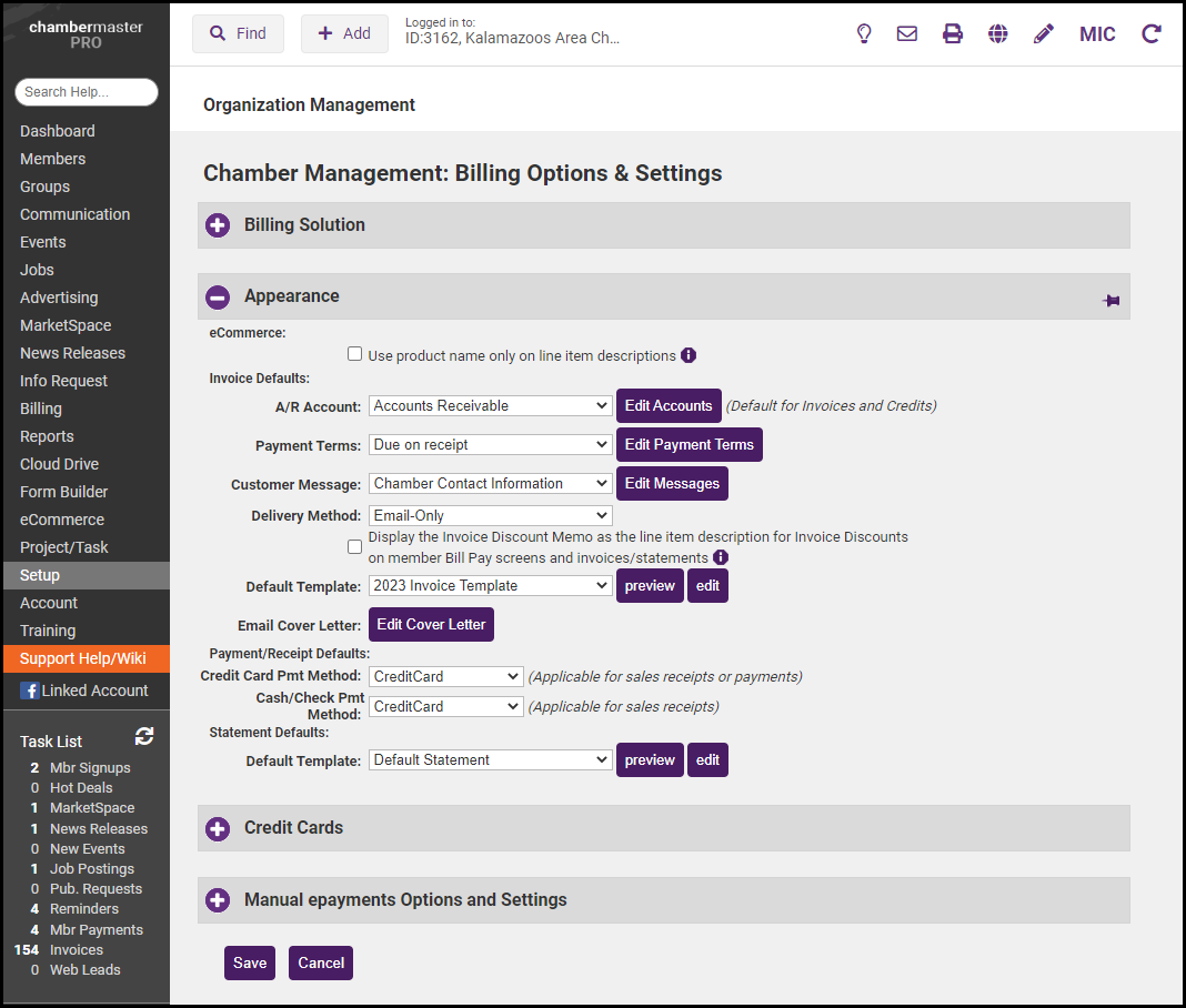 The Billing Options & Settings allow you to establish defaults for such things as the number of days ahead of the renewal month you wish the Task List to notify you that invoices need to be created, default invoice and statement templates you wish to use, credit card processing/manual e-payment settings, etc.