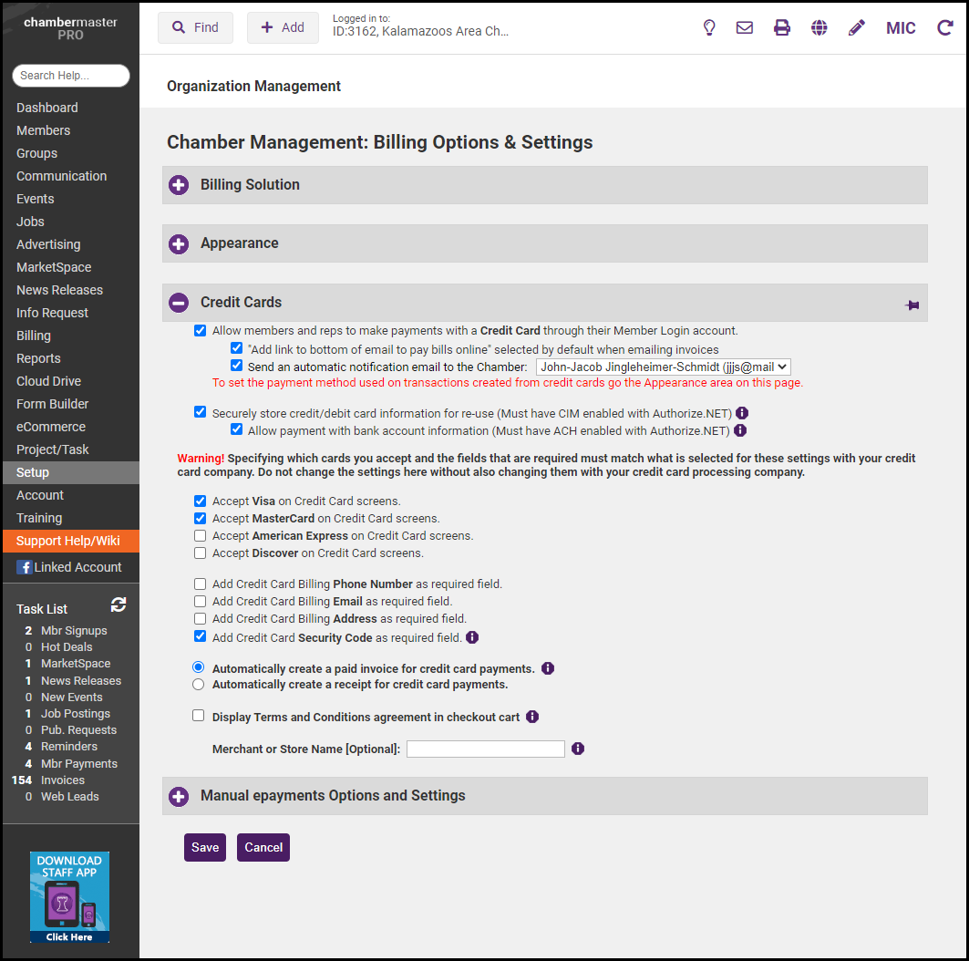Credit Cards: GrowthZone will assist you with the initial setup of the credit card processing.