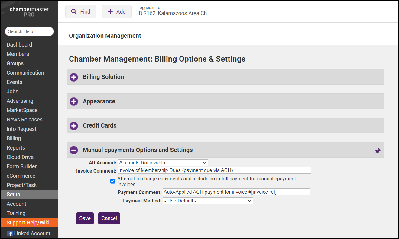 Manual epayments Options and Settings: Manual epayments mean that the financial transaction is done using a 3rd party or other outside financial institution. You are using ChamberMaster/MemberZone to create the billing transactions (usually an invoice and automatically applied payment)