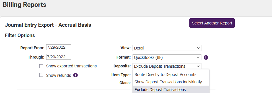 When choosing Journal Entry Export-Accrual Basis or Journal Entry Export-Cash Basis, the Deposit selection will determine how deposits created in ChamberMaster (if any) will be handled in the export.