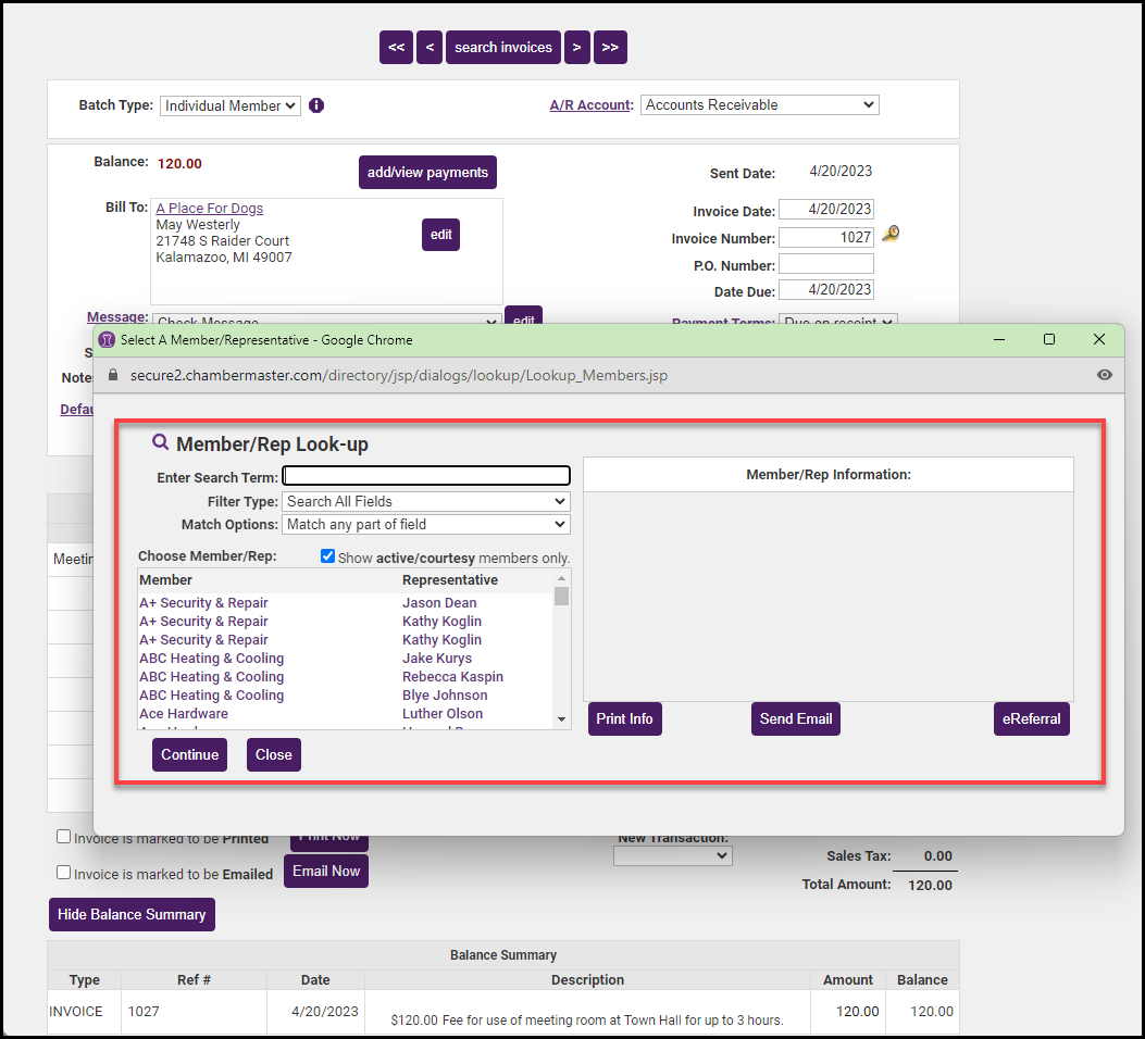 - In the Member/Rep Look-up window, select the member you wish to transfer the invoice to and click Continue.