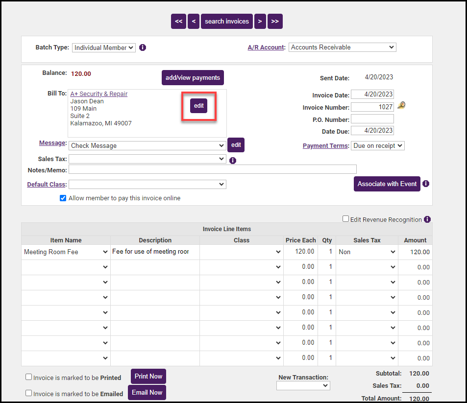- If necessary, click the Edit button in the Bill To box & choose the correct representative.