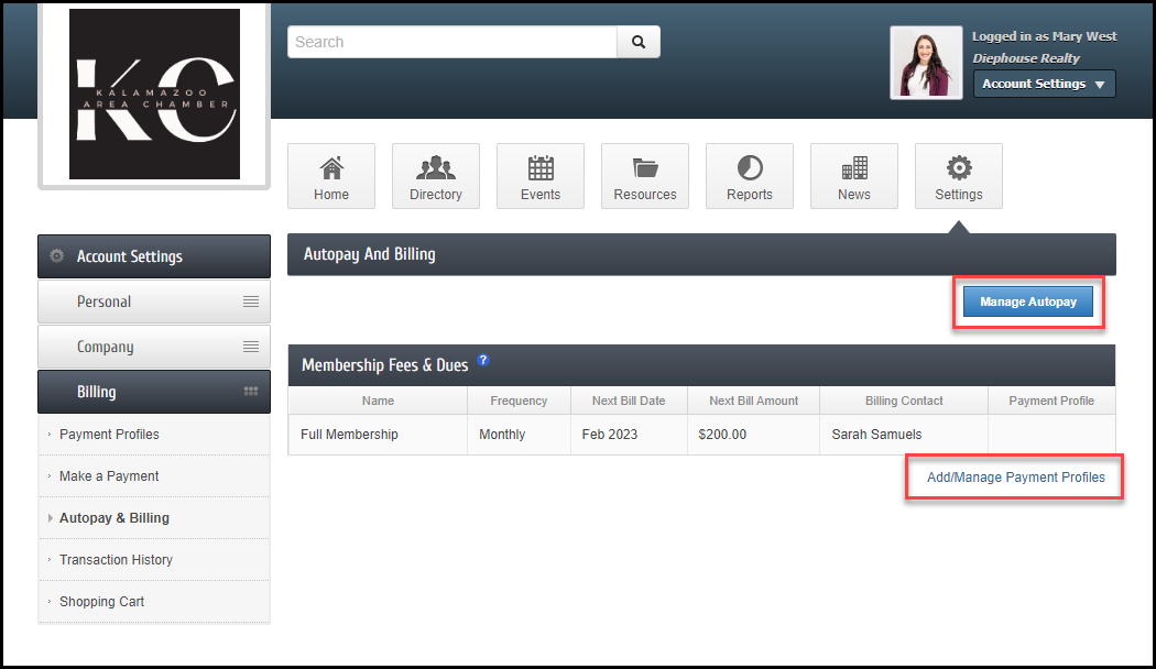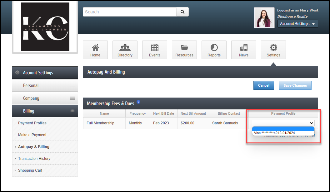 Select the Payment Profile you'd like to use for Autopay and select Save Changes.