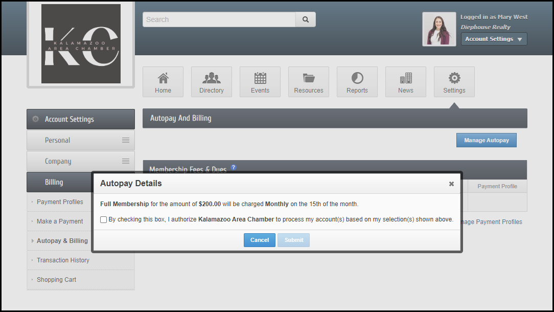 - Click the checkbox to notify your chamber you wish to be set up for automatic payments.