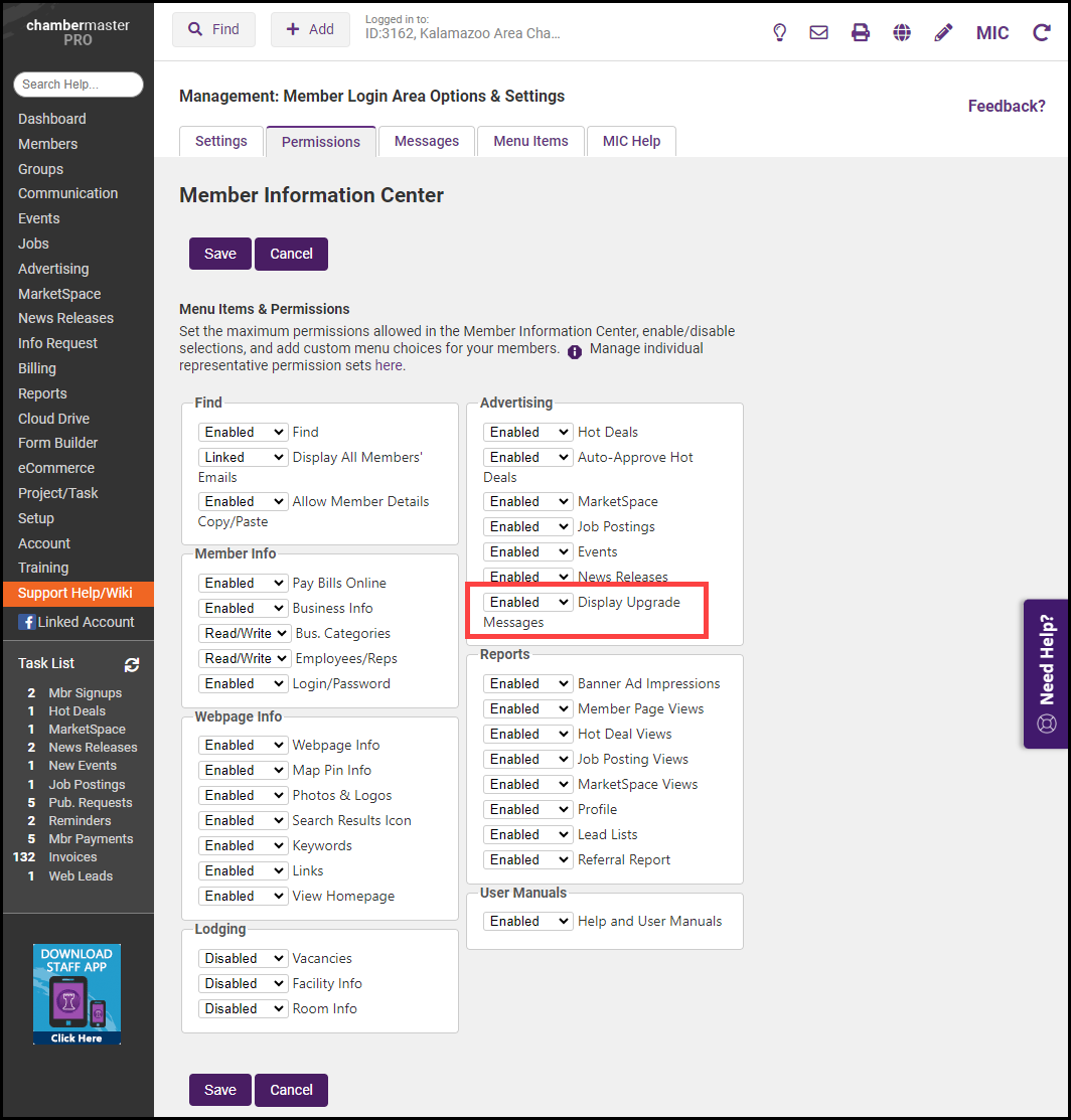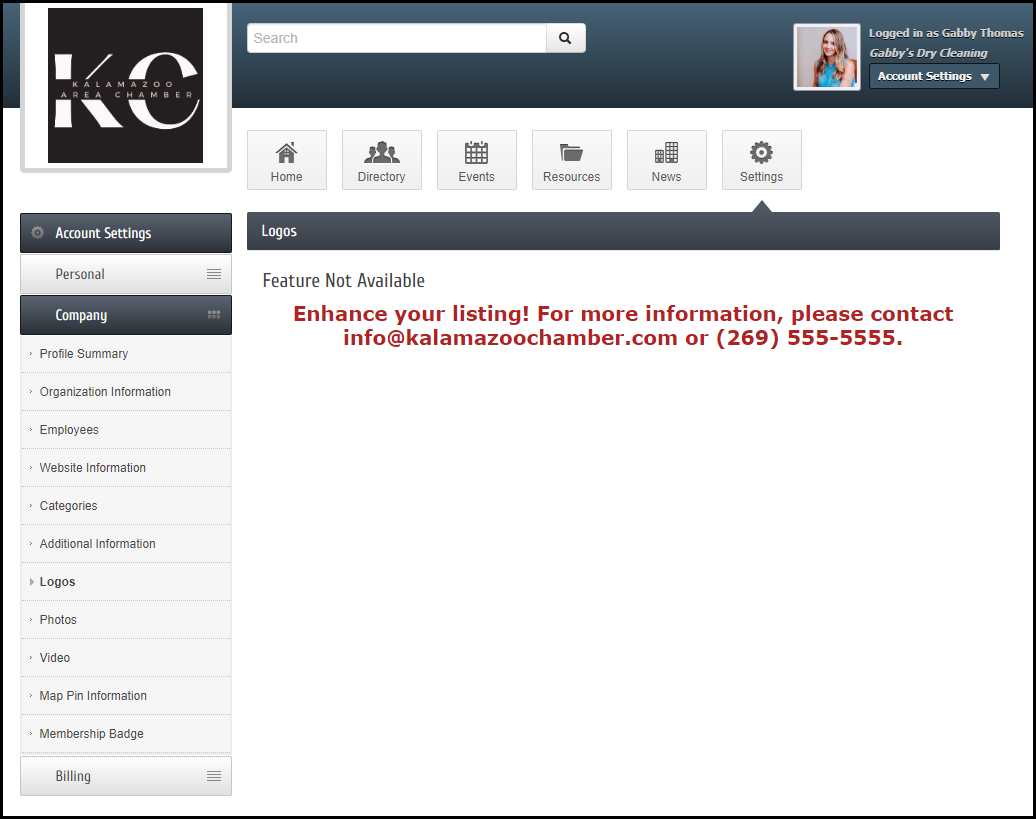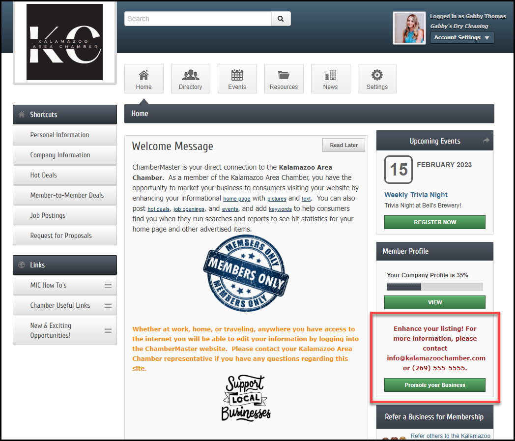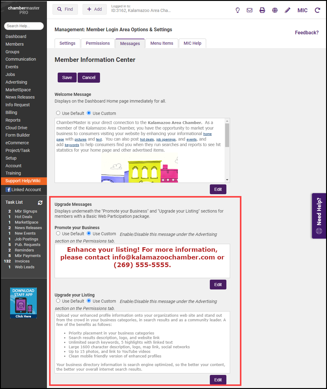 The Promote Your Business message will be displayed in the Member Information Center (MIC) for those who have a Basic Web Participation package to encourage them to upgrade to an Enhanced Web Participation package. You can enable/disable the message and edit the information displayed in the message. The Promote Your Business and Upgrade Your Listing messages appear on the Company Information > Profile Summary page.