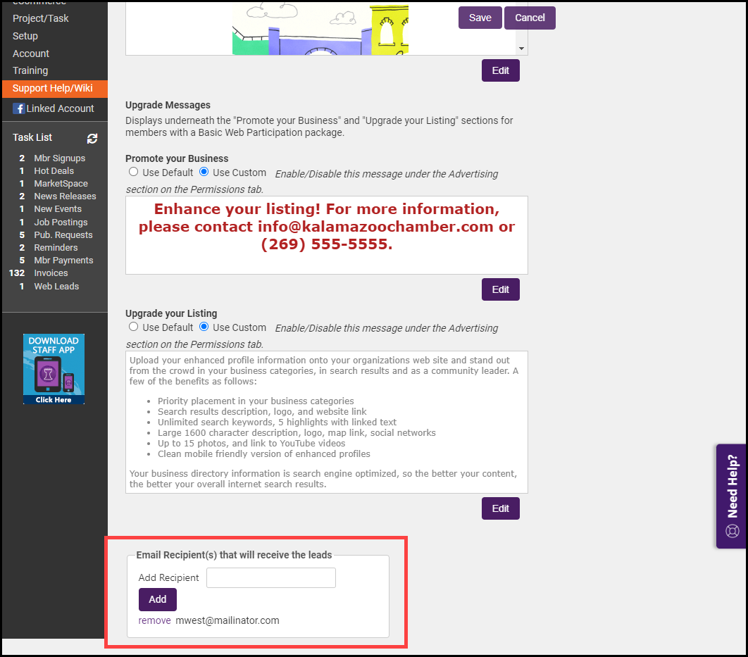 You can select which staff member in your organization should receive the email notification about Promote Your Business and Upgrade Your Listing leads.