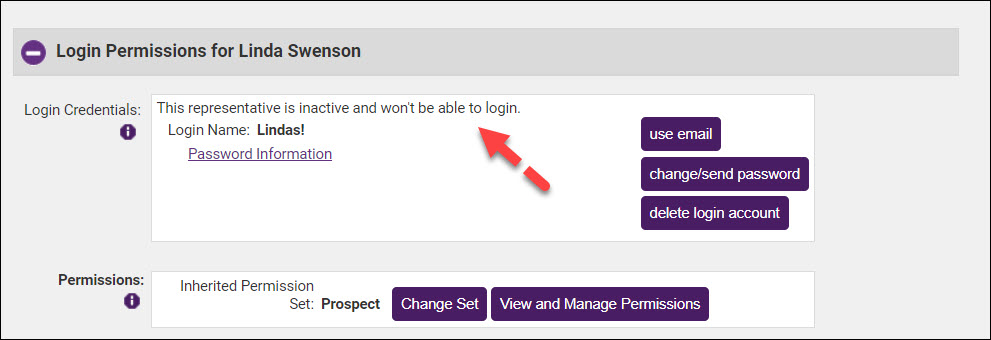 When a rep is inactivated, the login account will be automatically inactivated. If the rep is reactivated, the login account will automatically be reactivated. Additionally, when a member is dropped you will be given the option to inactivate logins for the associated reps. By inactivating the login, the credentials for this rep are retained in the database, should the rep return.
