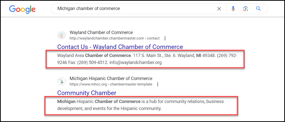 Meta Description is the snippet of text that appears directly under the URL and Page Title in search engine results. A description that stands out can motivate the user to click on a page, even if the page is not listed amongst the top search engine results. Unless changed by you or your member, the Meta Description defaults to the organization's name and category. The Meta Description is limited to 150 characters.