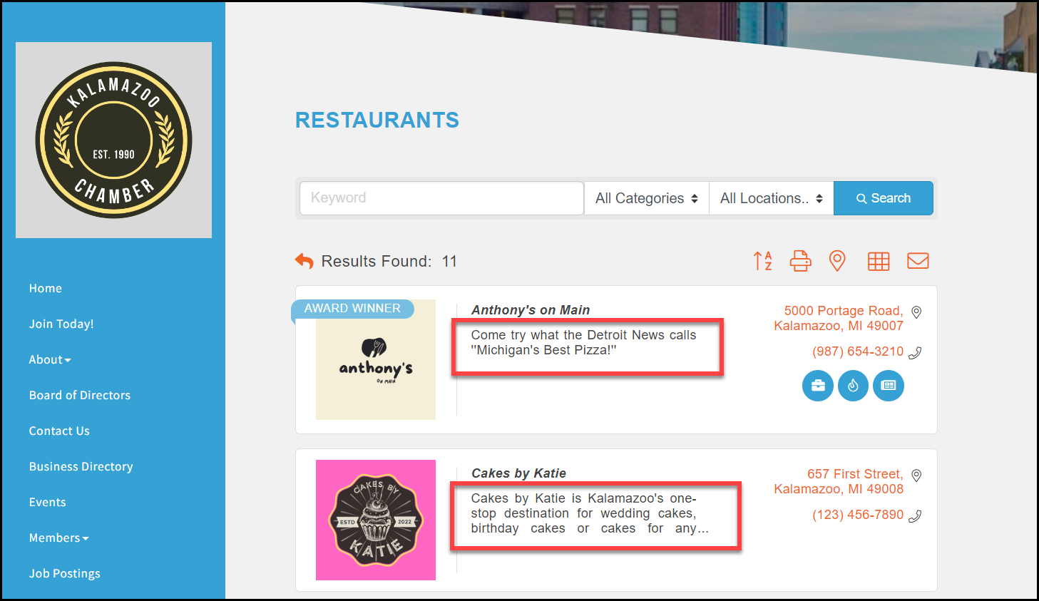 The Search Results Description appears on the search results of the member in your own association directory. Enter an eye-catching sentence or some type of summary of what a visitor would find if they clicked to view more about this member. The Search Results Description is limited to 200 characters.