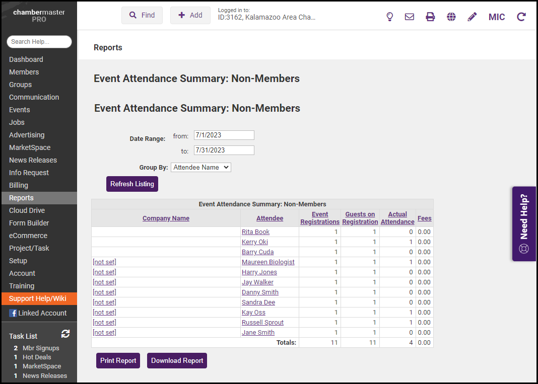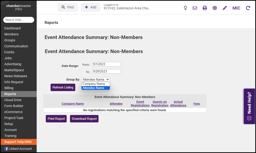 - Enter the desired Date Range and select how to group the results, either by Attendee Name or by Company Name. Select Refresh Listing.