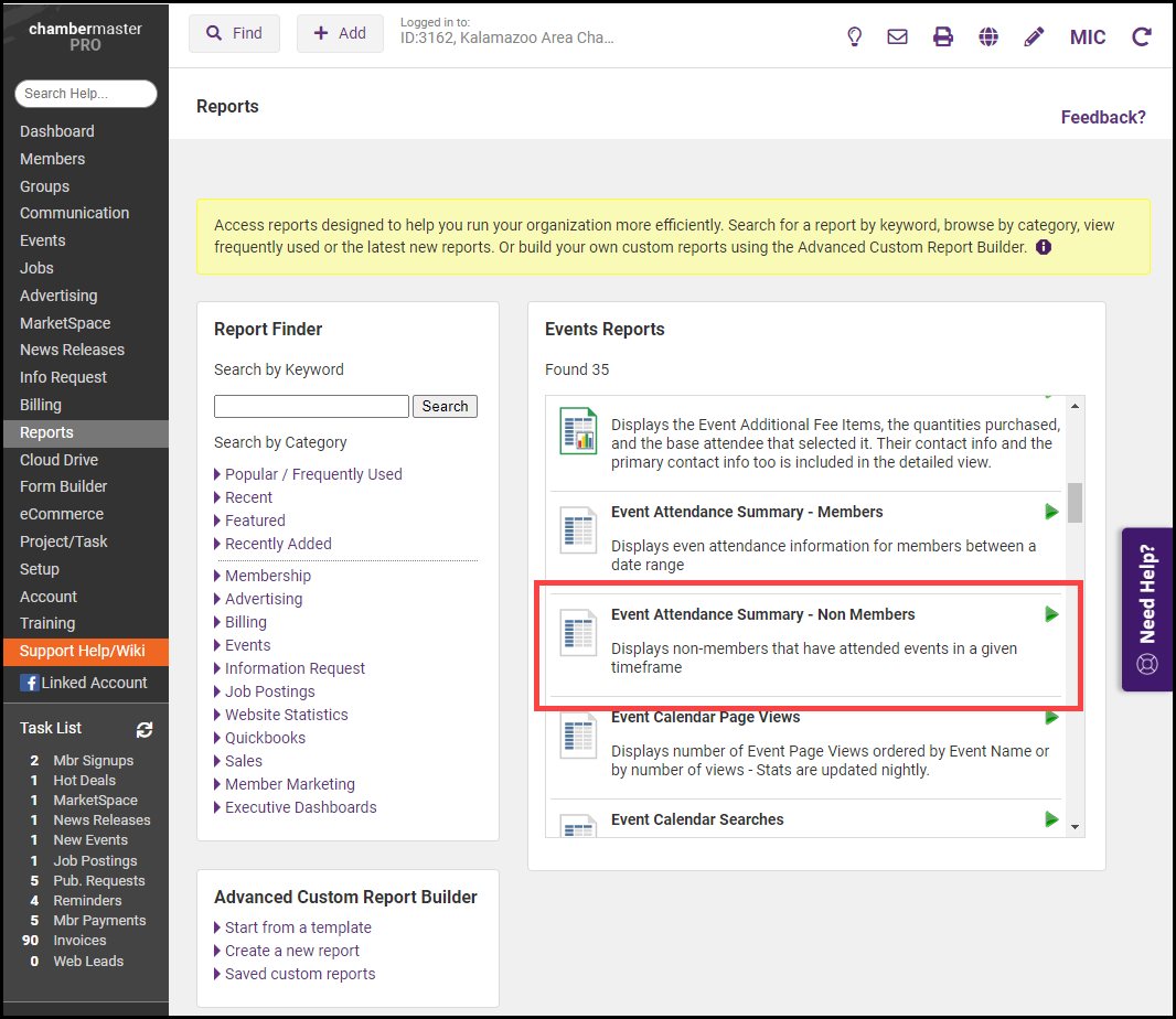 - Click on Reports in the navigation panel and locate the Event Attendance Summary - Non Members report.