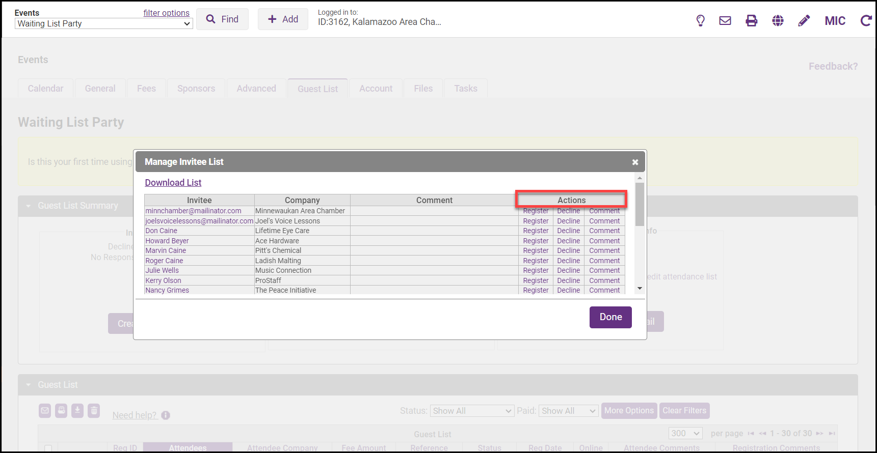 In the Actions column, click the Register link if you wish to register an individual, or click the Decline link to remove an individual from the list.
