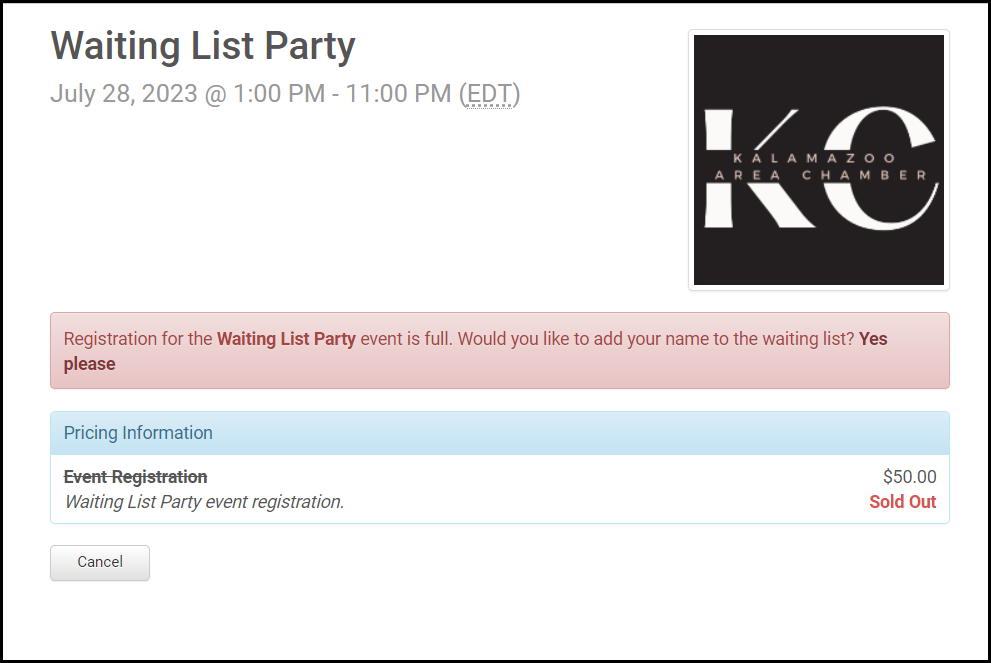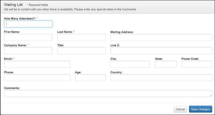 If you have checked Enable waiting list on the General tab and have reached the Limit Attendee Count To number, people wishing to register for the event will be notified that the event is full and asked if they would like to be placed on a waiting list.