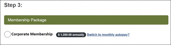 When Allow Switching from Annual to Monthly Payments is enabled, the packages that are offered on your membership application will display the annual price, with an option to select Switch to Monthly.