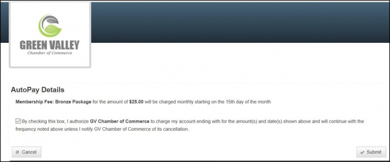 On check-out, the member will be prompted to provide credit card information (or select a stored card) and agree to monthly terms. If voluntary fees are included on the invoice, a member can pay the voluntary amount by entering it on the selection screen. The voluntary amount will be included in your monthly payment. For more information, see Switching from Annual to Monthly Billing for Your Members.