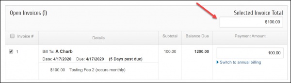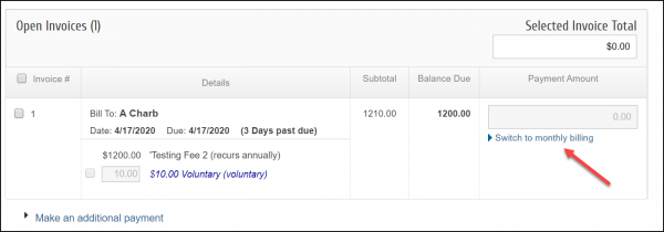 When Allow Switching from Annual to Monthly Payments is enabled, members will see a Switch to Monthly Billing link when viewing an open invoice in the MIC that has an annual frequency.
