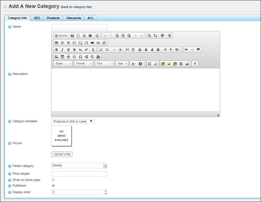Display Order: This is the order number for displaying the category. This display number is used to sort categories in the public store (ascending). The category with the display order 1 will be placed at the top of the list.
