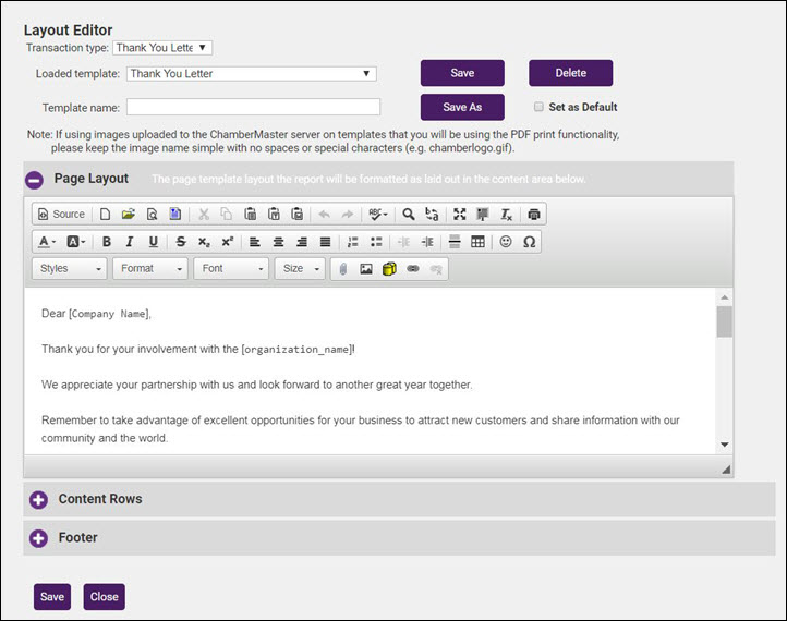 A Thank You letter report may be generated for those members who have paid their invoices. Once generated, you can easily send Thank You letters via email or print. Various filters are available to allow you to identify members. For example, you can filter the report by Membership Fees/Dues, and easily be able to thank your members for renewing. Templates may be created to customize your thank you letters and make it efficient to send out the letters.