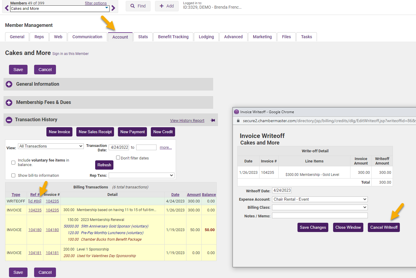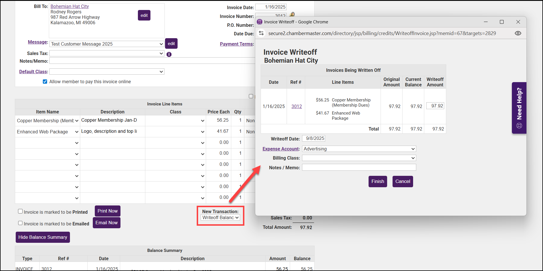 - If you’d like to write off all the open invoices to their original accounts, check the Write-off member balance(s) check mark and enter the desired write-off date.