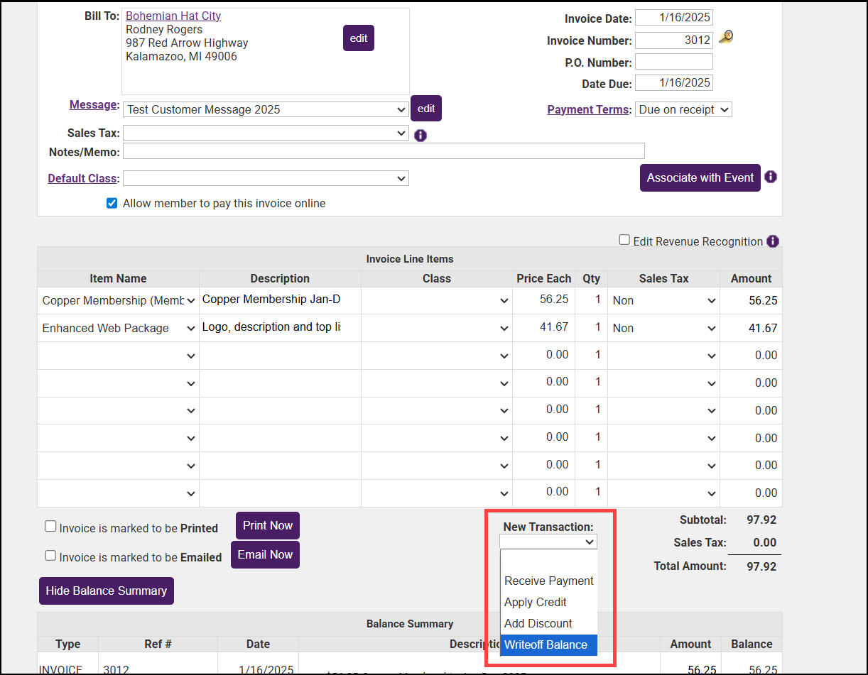 - Use the New Transactions dropdown menu to select Write-off balance.