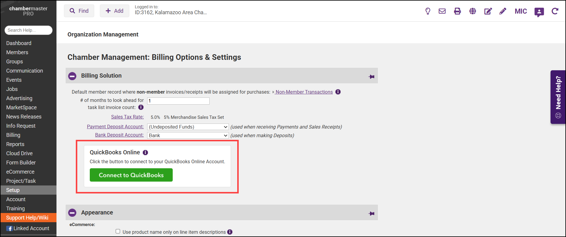 Click the Connect to QuickBooks button to disconnect and save. Refresh your page then go through the same process except this time when you click the Connect to QuickBooks button you enter your QuickBooks Online login information and say "yes" to the connection.