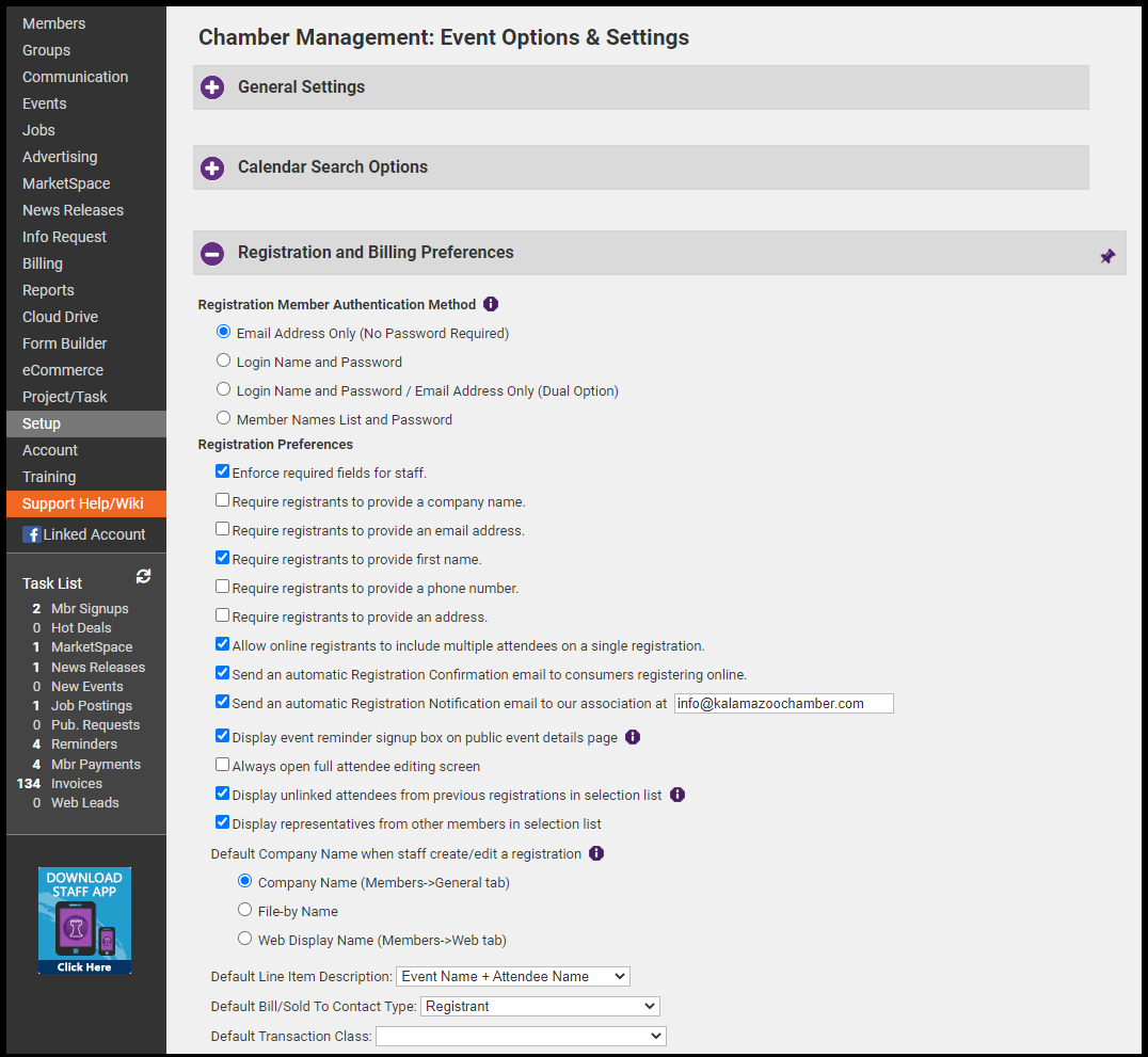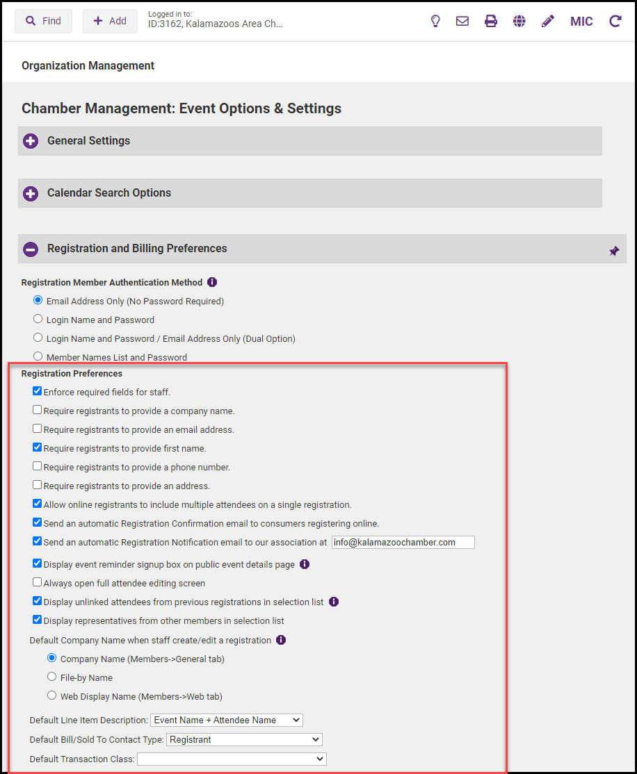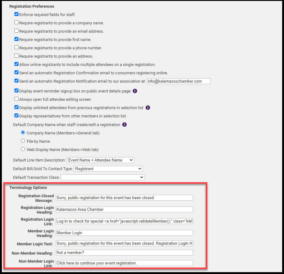 Chamber Message: Customize the message that appears on all event registration confirmation emails. The confirmation email must be enabled under the Events > Fees tab under Registration and Billing Preferences
