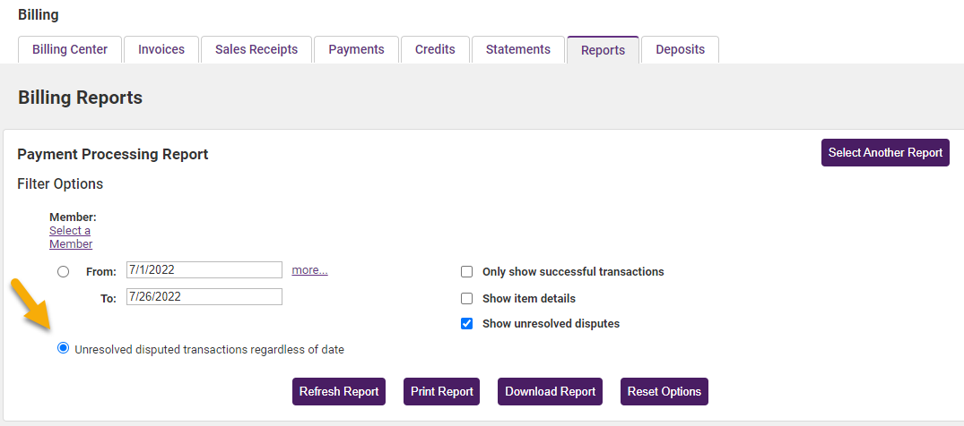 - Access the Payment Processing Report under Billing > Reports tab.